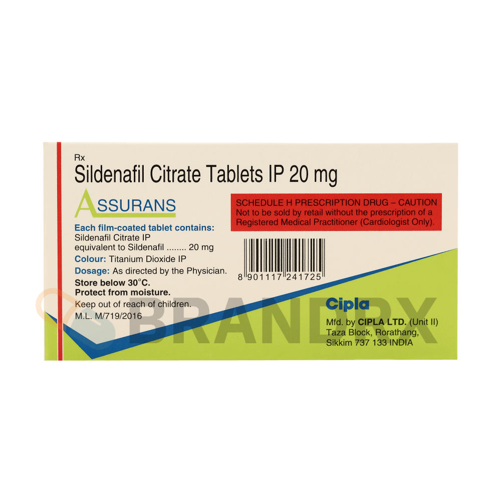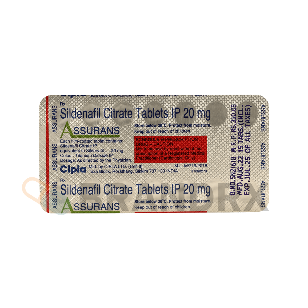 Assurans 20 mg is a tablet that is used to treat impotence or Erectile Dysfunction (ED) in males. If males lose their ability to achieve and sustain an erection is considered ED. This medication is designed to help males to recover the ability to get and maintain hard erections. The active ingredient of this medicine is Sildenafil Citrate.