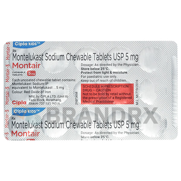 Montair Chewable 5 mg contains Montelukast as an active ingredient. It is used to relieve allergic symptoms. Physicians may prescribe this medication for other purposes not listed in this document.